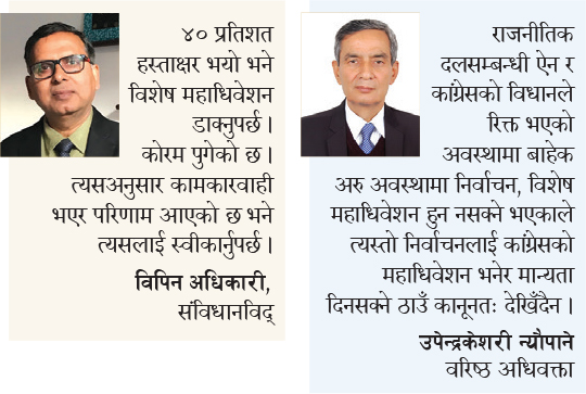 विशेष महाधिवेशनको वैधताका विषयमा कानुनका जानकारहरू पनि विभाजित देखिएका छन् । संविधानविद् विपिन अधिकारी विधानको व्यवस्था अनुसार बोलाइएको विशेष महाधिवेशन र त्यसले गर्ने निर्णय वैधानिक हुने तर्क गर्छन् । ‘४० प्रतिशत हस्ताक्षर भयो भने विशेष महाधिवेशन डाक्नुपर्छ । कोरम पुगेको छ । त्यसअनुसार कामकारवाही भएर परिणाम आएको छ भने त्यसलाई स्वीकार्नुपर्छ,’ उनले भने,‘यो प्रक्रियामा केही मान्छे संलग्न नभए पनि हामी यो महाधिवेशनलाई स्वीकार गर्दैनौं भनेर भनिराख्ने आधार विधानले अहिले संस्थापन भनिएको पक्षलाई छैन ।’ तर, वरिष्ठ अधिवक्ता उपेन्द्रकेशरी न्यौपाने भने अधिकारीको तर्कसँग सहमत छैनन् । उनी भृकुटीमण्डपमा सम्पन्न विशेष महाधिवेशनले वैधानिकता पाउने कानूनी आधार नभएको तर्क गर्छन् । ‘संविधान, राजनीतिक दलसम्बन्धि ऐन र कांग्रेसको विधानले रिक्त भएको अवस्थामा बाहेक अरु अवस्थामा निर्वाचन, विशेष महाधिवेशन हुन नसक्ने भएकाले त्यस्तो निर्वाचनलाई कांग्रेसको महाधिवेशन भनेर मान्यता दिनसक्ने ठाउँ कानूनतः देखिँदैन,’ उनले भने,‘संविधान, कानून र विधानभन्दा माथि कुनै भेला भएको छ भने त्यो भेलालाई आधिकारिक हो भनेर निर्वाचन आयोगले भन्छ भन्ने मलाई विश्वास छैन ।’