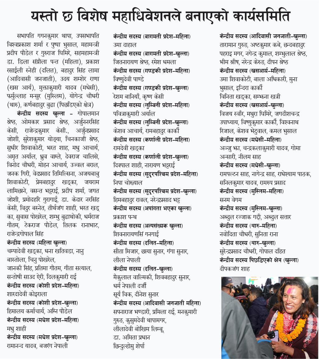 यसैबीच विशेष महाधिवेशनबाट निर्वाचित भएपछि बिहीबार बसेको पहिलो केन्द्रीय समिति बैठकले सभापति र उपसभापतिलाई जिम्मेवारी तोकेको छ । सभापति गगन थापालाई निर्वाचन घोषणापत्र लेखन समिति संयोजक र उपसभापति विश्वप्रकाश शर्मालाई निर्वाचन परिचालन समितिको संयोजकको जिम्मेवारी दिने निर्णय भएको प्रवक्ता देवराज चालिसेले जानकारी दिए । शुक्रबार पनि केन्द्रीय समिति बताइएको छ ।