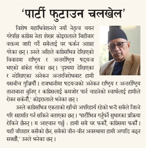महामन्त्रीद्वय र सहमहामन्त्रीलाई कार्बाही घोषणा गर्दा विशेष अधिवेशन बिथोलिने ठानेको संस्थापन पक्षका केही नेता यति बेला रनभुल्ल छन् । उनीहरू देउवा पक्ष बलियो भए उतै, अन्यथा गगन पक्षमा आउने बाटो हेरिरहेका छन् । विशेष महाधिवेशनमा आएर देउवा पक्षका केहीले भने आफ्नो नयाँ बाटो छुट्याएका छन् ।