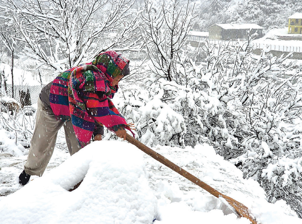 डोल्पाको जगदुल्ला गाउँपालिका–२ काइगाउँमा बुधबार घरको छानोमा परेको हिउँ पन्छाउँदै स्थानीय । गत मंगलबार रातिदेखि डोल्पाका विभिन्न भागमा भएको भारी हिमपातले जनजीवन कष्टकर बनेको छ । तस्बिर : रासस